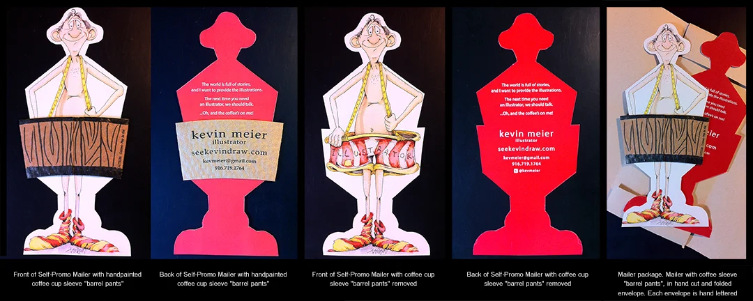 Just finished up a self promotion mailer for my illustration services. Thought I would share them here as well. After the character was created I cut out each one and then hand painted the wood planks on to the coffee sleeve, then put on his “barrel pants.”