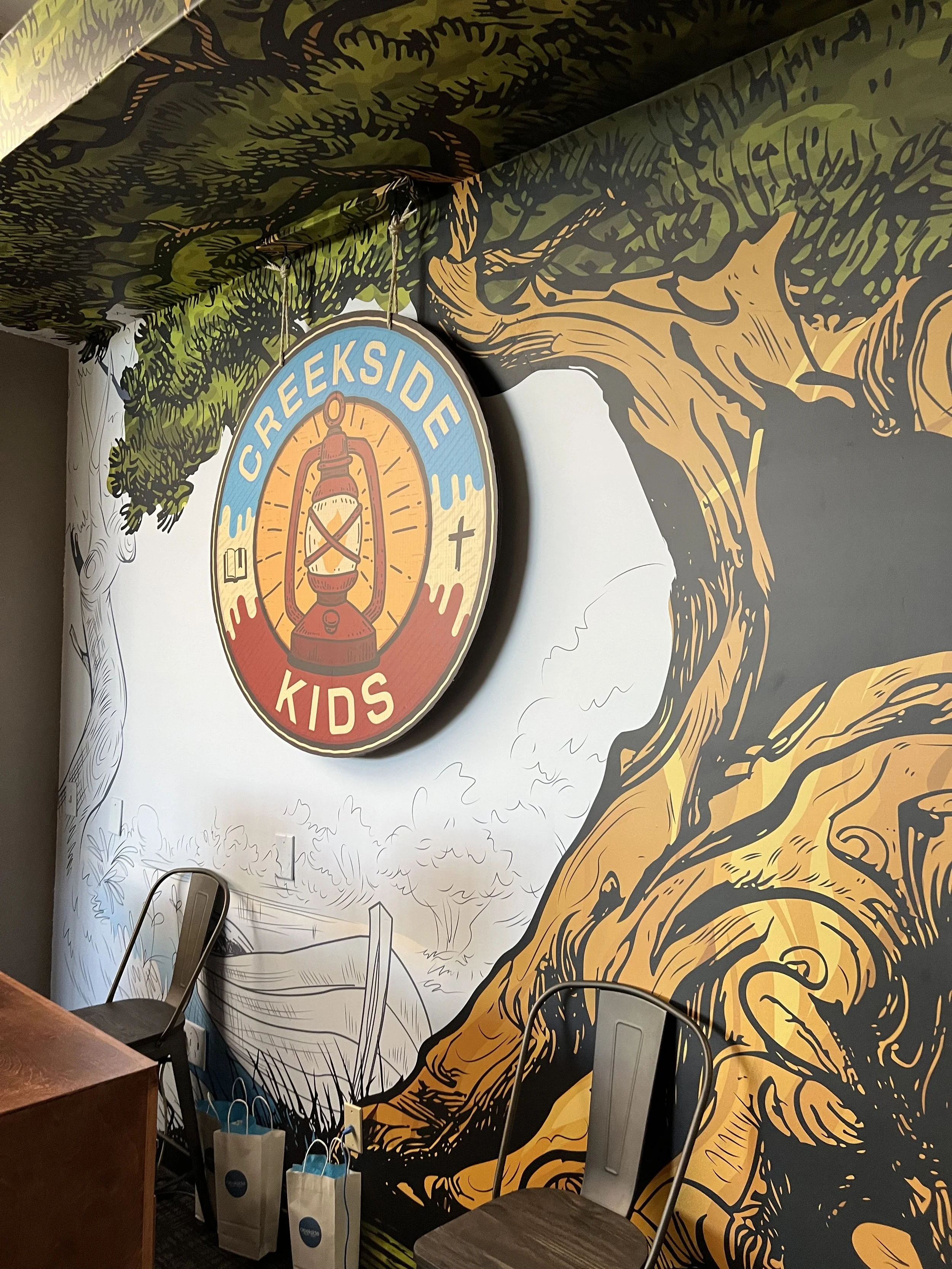 Had a lot of fun with this project! We took a whole wing of the church, full of white walls, and no character, and brought it to life with a kids camp theme, complete with a sketched look on all of the walls, little critters all around, and we created some “camp posters” that adorn the walls that create a fun new way to showcase the core values of the kids dept.